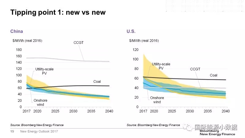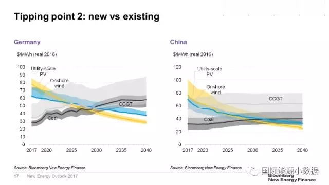 第一個(gè)臨界點(diǎn)是:在沒(méi)有補(bǔ)貼的情況下,新建風(fēng)電、光伏電站發(fā)電成本可與新建煤電、天然氣電站競(jìng)爭(zhēng)。在目前的市場(chǎng)條件下,在很多國(guó)家已經(jīng)接近這一臨界點(diǎn)。在德國(guó),新建陸上風(fēng)電的發(fā)電成本已經(jīng)低于煤電、天然氣發(fā)電;在中國(guó),目前煤電成本在各類(lèi)電源中依然是最低的,但是預(yù)期2019年陸上風(fēng)電成本將低于煤電、2021年光伏成本也將低于煤電;在美國(guó),天然氣發(fā)電是各類(lèi)電源中成本最低的,但預(yù)計(jì)2022-2023年風(fēng)電、光伏成本均將低于天然氣發(fā)電;在印度,預(yù)計(jì)2020年起新建光伏將在全國(guó)范圍內(nèi)低于煤電。