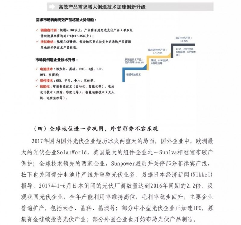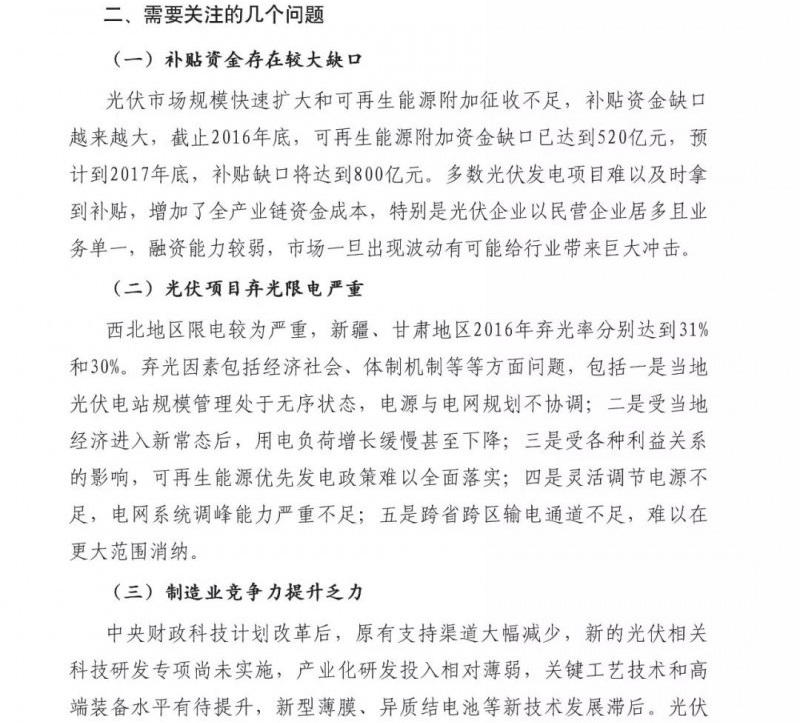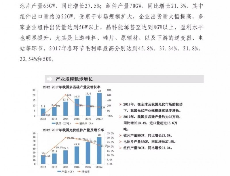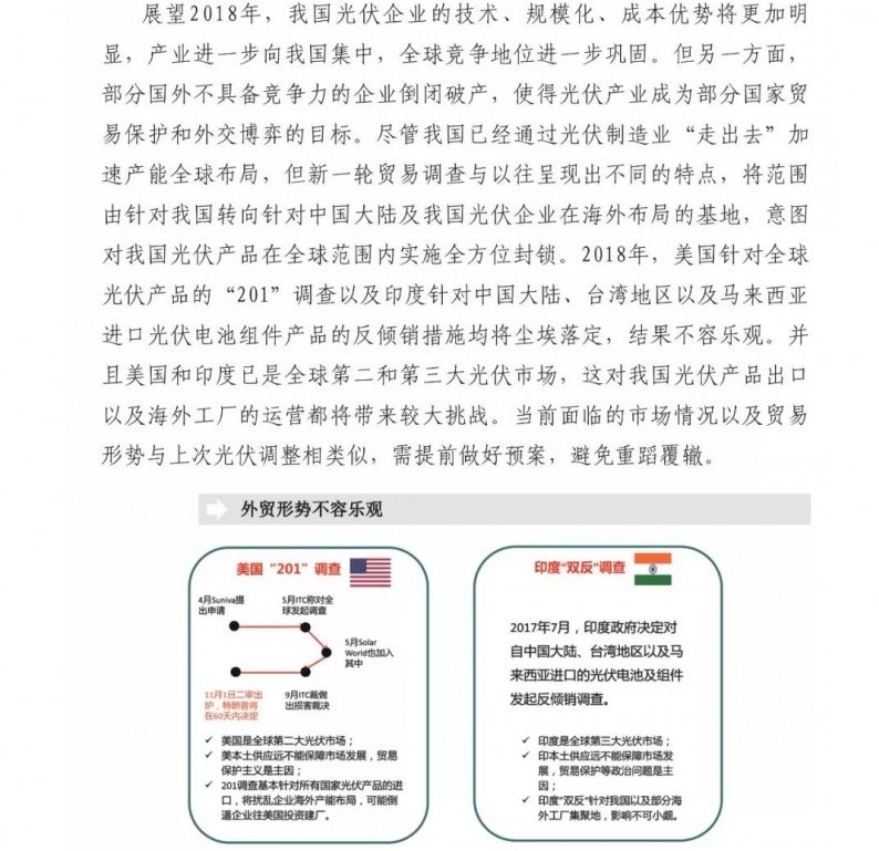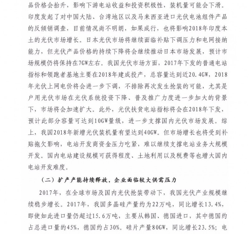 中國儲能網(wǎng)訊:近日,賽迪智庫發(fā)布了2018年中國光伏市場預測報告。重點如下:1、2018年全球光伏需求增量放緩,新增裝機量將達到85GW左右,同比下降15%;2、2018年我國光伏市場供需可能失衡,上下游各產(chǎn)業(yè)鏈環(huán)節(jié)產(chǎn)品價格都將進一步下探,企業(yè)將會承受較大價格壓力;3、高效光伏產(chǎn)品市場需求將會增大,倒逼我國光伏企業(yè)繼續(xù)加快技術升級。4、光伏市場規(guī)??焖贁U大和可再生能源附加征收不足,補貼資金缺口越來越大。