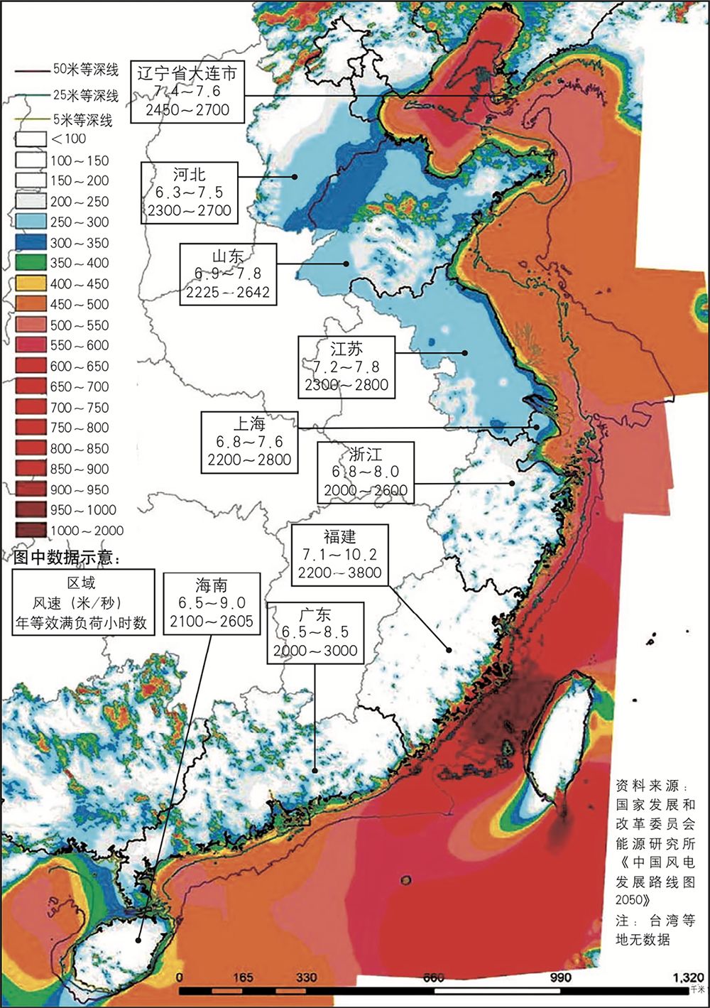 我國(guó)沿海各區(qū)域風(fēng)能資源分布圖