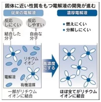 東京大學(xué)的山田淳夫教授等人在2014 年使用高濃度電解液,將電池的充電時間降到通常鋰離子電池的1/3已取得了成功。山田教授說:“在以往的常識中如果達到高濃度的話,電池反應(yīng)速度會變慢,高濃度電解液被認(rèn)為不適合于鋰離子電池。