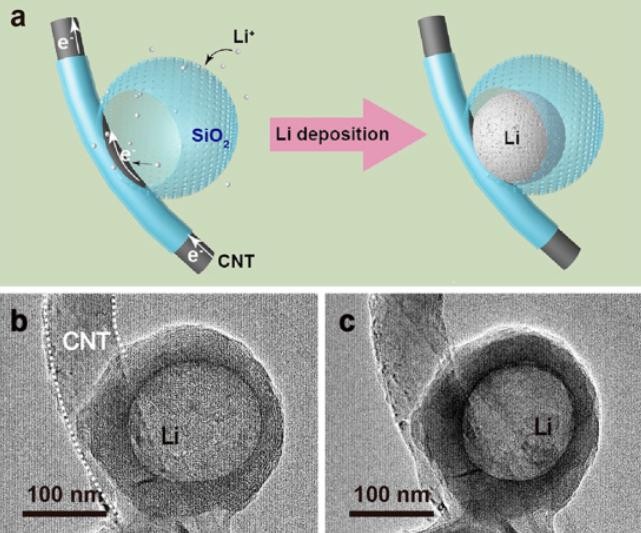 該團隊設計了復合微型籠式結(jié)構(gòu)(composite microcage),搭配碳納米管內(nèi)心(carbon nanotube core)及多孔硅護層(porous silica sheath)。復合微型籠式結(jié)構(gòu)可容納鋰金屬,其非均質(zhì)結(jié)構(gòu)可被用作鋰離子捕獲器(trapper)。