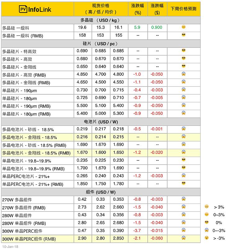 減少的國內(nèi)需求讓單,多晶組件價(jià)格都繼續(xù)下探,國內(nèi)常規(guī)組件價(jià)格普遍跌至每瓦2.65 - 2.68元人民幣之間,且跌勢持續(xù)中。由于二,三月會(huì)是今年上半年中需求最淡的時(shí)間點(diǎn),目前看來廠商的年前備貨力道并不會(huì)太強(qiáng)勁。
