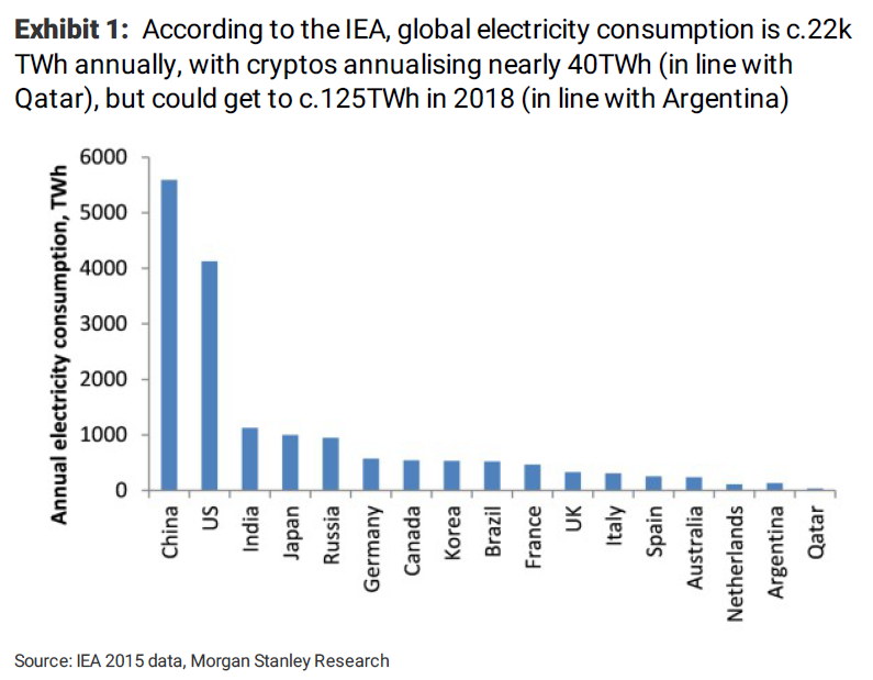 摩根士丹利股票分析師Nicholas Ashworth在其1月10日研報中預(yù)計,2018年比特幣乃至其他數(shù)字貨幣的挖礦用電需求將達(dá)到120-140萬億瓦時 (terawatt-hours),而全球電動車的能源消耗到2025年預(yù)計才不過125萬億瓦時,并據(jù)此給出了“比特幣2018=電動車2025”的用電需求論斷。