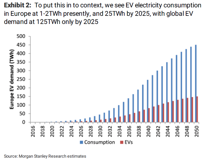 在與其他核心新興產(chǎn)業(yè)進(jìn)行橫向?qū)Ρ葧r,結(jié)論則更為驚人。眾所周知,電動車/新造車概念是2017年炙手可熱的新興概念;大摩此前預(yù)計電動車在歐洲的率先普及使用,將在2018年帶來1-2萬億瓦時的電力需求,到2025年達(dá)到25萬億瓦時,而全球電動車用電需求則將達(dá)到125萬億瓦時。