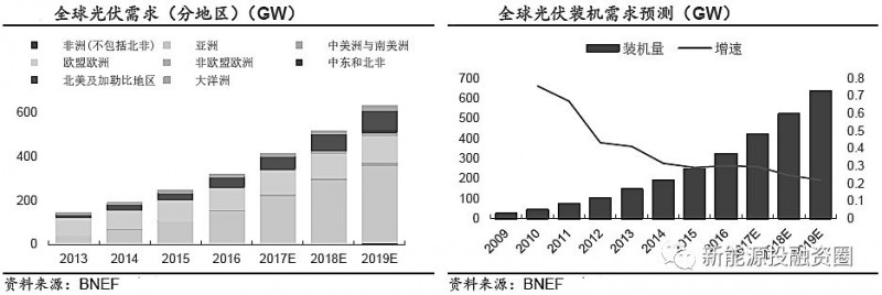 新興國家未來幾年光伏將迎來上升期,地理條件、政策支持將使裝機需求增幅較大。但總體量上對全球影響還是很小。2018 年全球裝機增加仍主要依靠中國、印度等光伏大國。