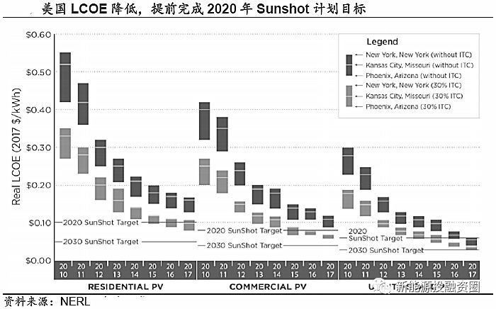 Sunshot 計劃降低太陽能發(fā)電成本,政策計劃推動光伏成本競爭優(yōu)勢:Sunshot 計劃于2011 年推出,旨在降低太陽能發(fā)電成本。住宅式和商用式光伏發(fā)電成本分別實現(xiàn)了2020年計劃的86%和89%,公用事業(yè)光伏發(fā)電已經(jīng)提前三年達到目標(biāo),成本已經(jīng)降到0.06美元/kWh。新Sunshot 計劃2030 年公用事業(yè)光伏發(fā)電成本0.3 美元/kWh,商用0.04美元/kWh,住宅0.05 美元/kWh,將消減太陽能發(fā)電成本50%。太陽能光伏發(fā)電成本優(yōu)勢突出。