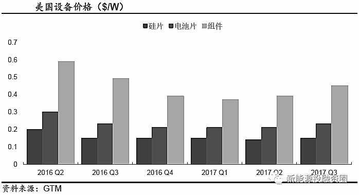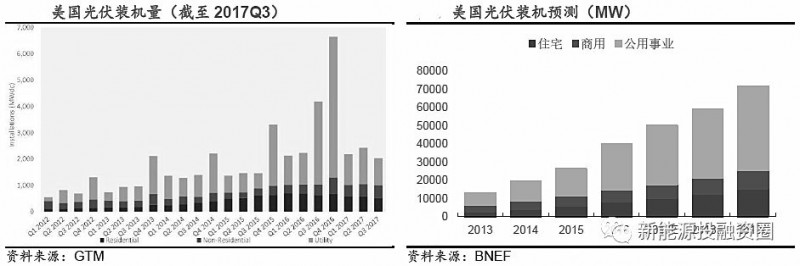 2017 年美國整體光伏裝機表現(xiàn)良好:17 年第一季度的安裝量為2044MWdc,比去年同期略有下滑,但考慮到16 年情況特殊,一季度整體可以。第二季度安裝量為2387MWdc,比去年同比增加8%,創(chuàng)史上二季度安裝量新高。三季度則為2031MWdc,低于去年,主要受政治不確定、設(shè)備價格上漲影響??傮w來看,2017 美國光伏裝機量保持穩(wěn)定,預(yù)計2017 年全年安裝量會超過8GWdc。
