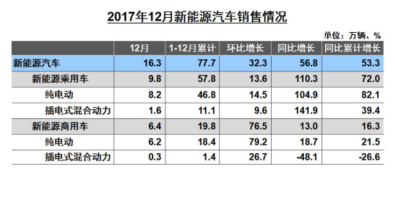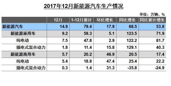 中國儲能網(wǎng)訊:近日,中國汽車工業(yè)協(xié)會對外發(fā)布數(shù)據(jù)顯示,新能源汽車12月生產(chǎn)14.9萬輛,1-12月累計生產(chǎn)79.4萬輛,環(huán)比增長17.9%,同比增長68.5%同比累計增長53.8%。12月,新能源汽車銷售16.3萬輛,1-12月累計銷售77.7萬輛。環(huán)比增長32.3%,同比增長56.8%,同比累計增長53.3%。