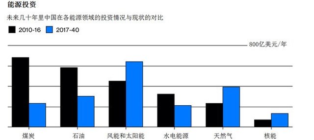 我們可以看到,到2040年,中國將投入6.4萬億美元用于能源供應(yīng),其中低碳能源(包括核能)投入占2.3萬億美元。除了能源供應(yīng),中國將在低碳科技產(chǎn)業(yè)(比如電動汽車產(chǎn)業(yè))上投入1.3萬億美元,在提高能源效率方面投入2.1萬億美元。中國還將投入1.9萬億美元于電網(wǎng)建設(shè)。到2040年,在統(tǒng)一分配可再生能源、電動汽車和能源效率方面,中國每年將投入超過2200億美元。做個比較,根據(jù)國際能源署估計,去年全球在可再生能源的運輸和提效方面的總投資不超過5500美元。