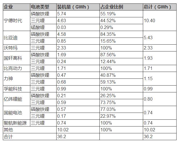 裝機(jī)總電量前10的動(dòng)力電池企業(yè)合計(jì)約為26.22Wh,占整體的72.3%。其中,寧德時(shí)代10.4GWh的裝機(jī)量約占總量的30%,比亞迪緊隨其后,占比約15%。(注釋:動(dòng)力電池裝機(jī)量為保守統(tǒng)計(jì)數(shù)據(jù),源于新能源汽車產(chǎn)量與其搭載的電池容量乘積,即車型搭載電池容量*車型產(chǎn)量;由于未考慮其他影響因素,與電池廠商實(shí)際產(chǎn)量或有出入,本文數(shù)據(jù)僅作參考。)