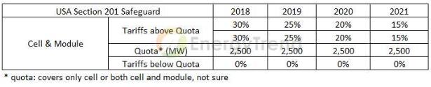 根據(jù)美國ITC所公告的Fact Sheet(https://ustr.gov/sites/default/files/files/Press/fs/201%20Cases%20Fact%20Sheet.pdf),太陽能電池與模塊之201條款最后決定的方案如下: