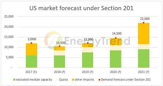 根據(jù)EnergyTrend的海關(guān)資料統(tǒng)計(jì),美國目前已有5~6GW的組件庫存,因此1H18幾乎不會(huì)有拉貨需求,2H18也會(huì)優(yōu)先向上述不受201案影響的產(chǎn)能采購。