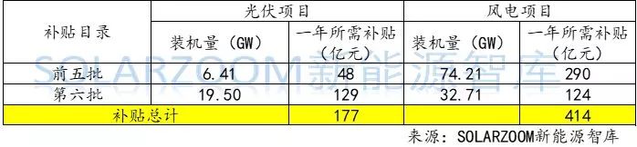 進入前六批可再生能源補貼目錄的電站項目中,風力發(fā)電項目和光伏發(fā)電項目裝機量占比超過95%,因此記者在可再生能源補貼測算中不涵蓋生物質(zhì)能和地熱能等補貼測算。經(jīng)測算,目前涵蓋在以發(fā)放的前六批可再生能源補貼目錄中,光伏項目每年所需要的補貼為177億元,風電每年所需要的補貼為414億元。