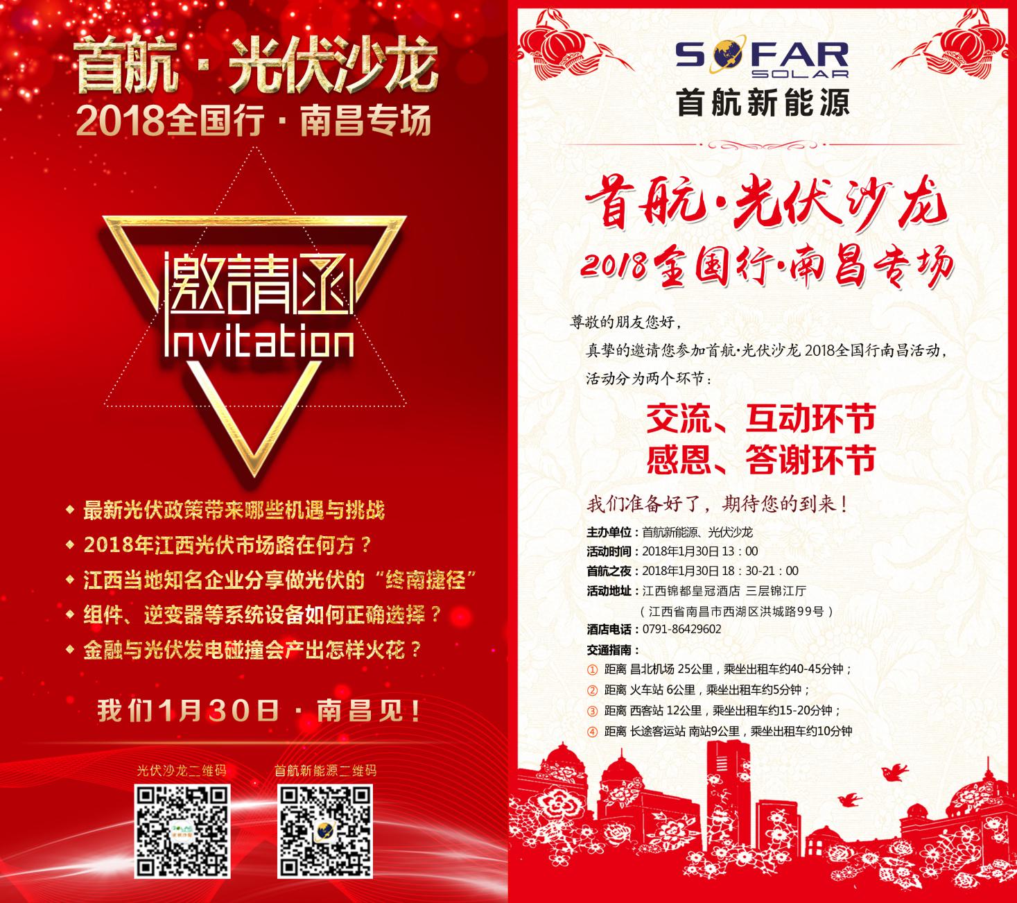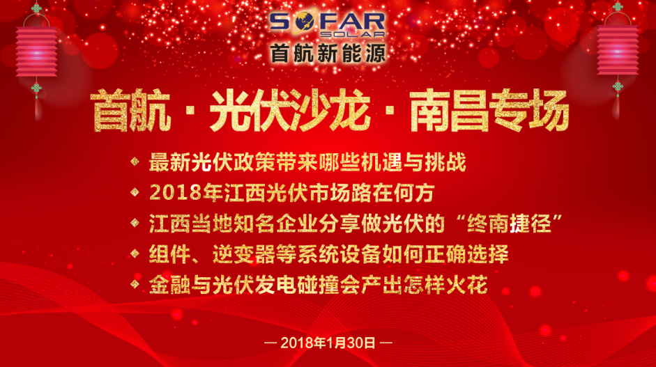 中國儲能網(wǎng)訊:由首航新能源,尚德·益家、泰坦光伏等企業(yè)聯(lián)合舉辦的“光伏沙龍全國行”活動,將于1月30日下午1點在江西南昌錦都皇冠酒店(西湖區(qū)洪城路99號)拉開帷幕,屆時光伏產(chǎn)業(yè)鏈數(shù)百家企業(yè)參會,參會人員覆蓋組件、逆變器、支架、監(jiān)控、系統(tǒng)等細分領(lǐng)域。同時,當?shù)叵嚓P(guān)部門領(lǐng)導、協(xié)會、媒體也將出席該場活動。