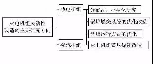 火電機(jī)組靈活性改造的研究方向:火電機(jī)組分為熱電機(jī)組和凝汽機(jī)組兩大類,歐美多數(shù)廣泛使用熱電聯(lián)產(chǎn)機(jī)組,但其中較大比重為大容量抽凝式機(jī)組;國(guó)內(nèi)兩類機(jī)組都普遍存在,熱電機(jī)組裝機(jī)容量大約為火電總裝機(jī)容量的32%?;痣姍C(jī)組靈活性主要包括機(jī)組的調(diào)峰深度,爬坡能力和啟停速度等內(nèi)容,改造主要的研究方向如圖1所示。調(diào)峰運(yùn)行方式的優(yōu)化和鍋爐燃燒系統(tǒng)的優(yōu)化改造是火電機(jī)組靈活性改造的主要手段。
