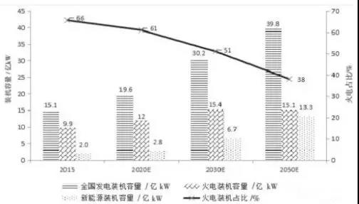 據(jù)中國(guó)電力企業(yè)聯(lián)合會(huì)預(yù)測(cè), 2020年、2030年、2050年是我國(guó)火電產(chǎn)業(yè)發(fā)展的重要節(jié)點(diǎn),未來(lái)我國(guó)火電產(chǎn)業(yè)將進(jìn)入衰退期。2020年, 火電裝機(jī)容量占總裝機(jī)容量61%, 2030年下降到51%, 到2050年進(jìn)一步下降至38%,而新能源裝機(jī)占比持續(xù)上升, 到2050年, 新能源裝機(jī)占比已上升至33%?;痣娧b機(jī)容量一路下行的數(shù)據(jù)拐點(diǎn),無(wú)情地證明了火電產(chǎn)業(yè)規(guī)模逐年遞減。