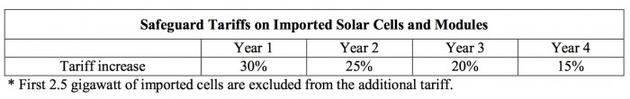 2018年1月22日,美國總統(tǒng)特朗普確認通過201條款,將對光伏電池及組件額外征收30%關(guān)稅,未來4年穩(wěn)步遞減至15%,即2018-2021年稅率分別為30%、25%、20%、15%,且每年將有2.5GW光伏產(chǎn)品擁有豁免權(quán)。