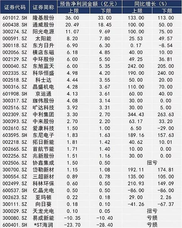 31家A股光伏企業(yè)預(yù)告凈利潤(rùn)數(shù)據(jù)一覽
