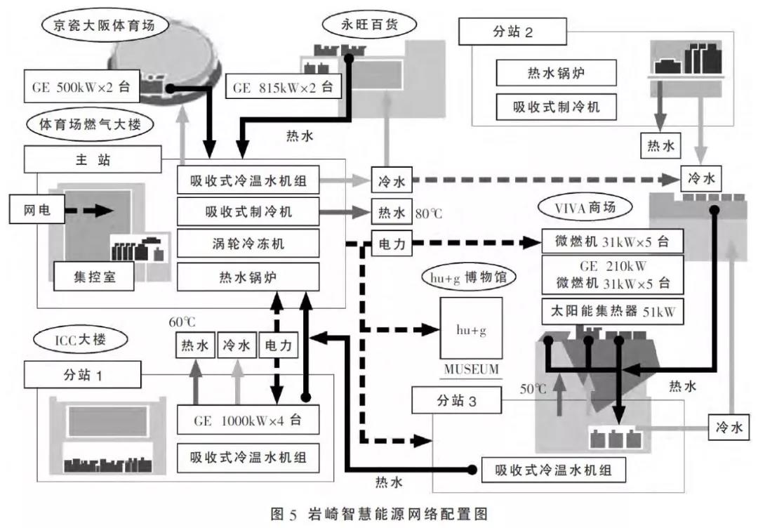 永旺百貨配有1630kW的熱電聯(lián)產(chǎn)機(jī)組,京瓷體育場(chǎng)配置有1000kW熱電聯(lián)產(chǎn)機(jī)組,“hu+g”博物館配有停電對(duì)應(yīng)型熱電聯(lián)產(chǎn)機(jī)組(420kW)、SOFC燃料電池(4kW)、太陽(yáng)能集熱器(120kW)、光伏發(fā)電系統(tǒng)(20kW)和蓄電池(50kW˙h)。區(qū)域內(nèi)建筑用戶與能源站進(jìn)行電、熱融通,從面域?qū)用鏄?gòu)建高效能源利用體系。