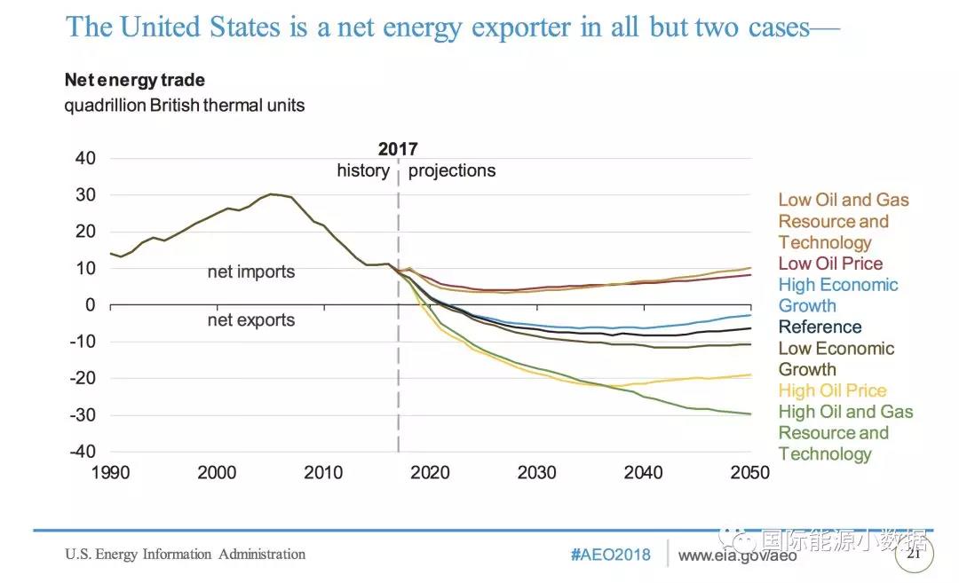 值得注意的是,在參考情景下,即便美國從2022年起成為能源凈出口國,美國將繼續(xù)是石油的凈進(jìn)口國(進(jìn)口原油、出口石油產(chǎn)品),到2050年也不會改變。