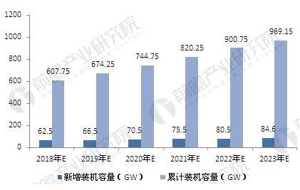 2018-2023年全球風(fēng)電新增和累計裝機(jī)容量預(yù)測(單位:GW)