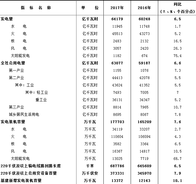 2017年全國電力工業(yè)統(tǒng)計快報一覽表