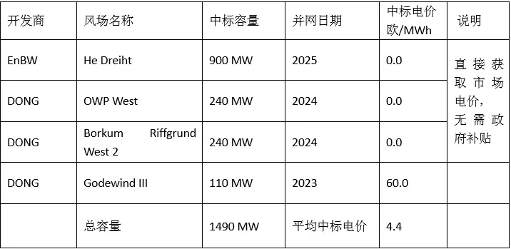 表1 德國第一輪電價(jià)競標(biāo)結(jié)果