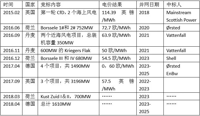 三、 歐洲海上風(fēng)電市場競標(biāo)情況