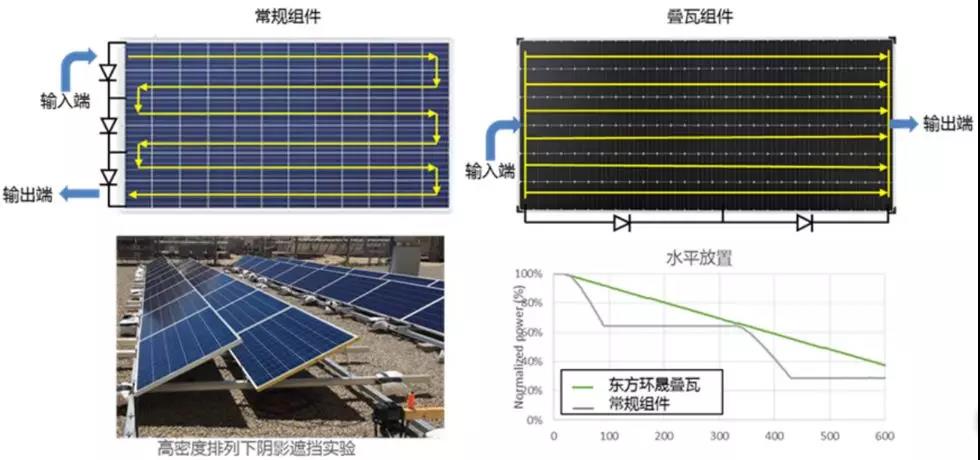 (2)高發(fā)電量。疊瓦組件無焊帶與疊瓦電池連接設(shè)計(jì),保證了充裕的電流通路,也減少了組件功率衰減,在同等生命周期性下較常規(guī)組件提升更多發(fā)電量。值得一提的是,使用全并聯(lián)電路設(shè)計(jì)的疊瓦組件功率下降與陰影遮蔽面積呈線性關(guān)系,與其它常規(guī)組件相比,在陰影遮擋的條件下表現(xiàn)更好,更適合高緯度地區(qū)、土地集約項(xiàng)目,以及分布式項(xiàng)目等。