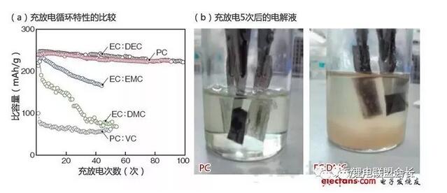 東京理科大學(xué)通過將PC和EC:DEC用于電解液,實(shí)現(xiàn)了充放電循環(huán)特性出色的鈉離子充電電池,并于2009年春進(jìn)行了相關(guān)發(fā)表(a)。如果是鋰離子充電電池利用的EC:DMC的話,電解液立即就會(huì)劣化(b)。