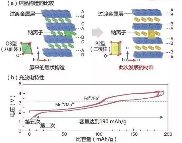 僅以鐵構(gòu)成的NaFeO2一般采用鈉和氧形成八面體網(wǎng)格的O3型積層構(gòu)造,以3.5V以上電壓充電時(shí),隨著鐵離子的移動(dòng)會(huì)發(fā)生不可逆相變。而P2型Na2/3(Fe1/2Mn1/2)O2即使充電電壓超過3.5V,也可以根據(jù)鐵的氧化還原反應(yīng)獲得可逆容量,充電電壓提高至4.5V時(shí)仍能維持層狀構(gòu)造。