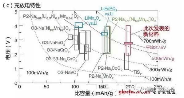 東京理科大學(xué)在本屆電池研討會(huì)上就擁有高比容量的正極材料Na2/3(Fe1/2Mn1/2)O2發(fā)表了演講。鈉和氧以三棱柱構(gòu)造(P2型)排列(a)。通過錳和鐵的氧化還原反應(yīng)實(shí)現(xiàn)了190mAh/g的高容量(b)。雖然新材料的平均電位稍低,只有2.75V,但作為電池可實(shí)現(xiàn)高能量密度(c)。