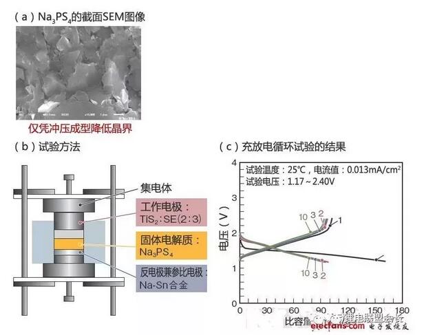 大阪府立大學(xué)在電池研討會(huì)上就固體電解質(zhì)采用Na3PS4的全固體電池發(fā)表了演講(a,b)。與初始放電容量相比,第二次以后的放電容量大幅降低,不過第二次以后表現(xiàn)出了穩(wěn)定的循環(huán)特性(c)。