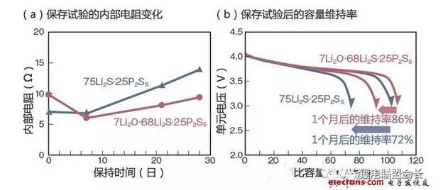 豐田確認(rèn),作為全固體電池的固體電解質(zhì),具備高耐水性的75Li2S˙25P2S5在60℃的保存試驗(yàn)中,內(nèi)部抵抗難以上升(a)。試制充電電池測(cè)量容量變化時(shí)發(fā)現(xiàn),1個(gè)月后保持了86%的容量(b)。(圖由《日經(jīng)電子》根據(jù)豐田的資料制作)