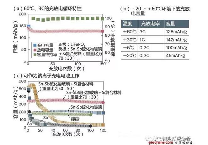 五鈴精工硝子開發(fā)出了經(jīng)過150次循環(huán)充放電后實(shí)現(xiàn)99%的容量維持率的鋰離子充電電池(a)??稍?20~+60℃的大溫度范圍內(nèi)使用(b)。特點(diǎn)是負(fù)極材料采用了Sn-Sb硫化物玻璃,還可用于鈉離子充電電池(c)。