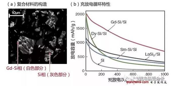 鳥取大學(xué)研究生院與三德推進(jìn)了將稀土類硅化物與硅的復(fù)合材料用于鋰離子充電電池負(fù)極的研究(a)。共有多項(xiàng)候補(bǔ),其中作為稀土類金屬,采用Gd(釓)的Gd-Si/Si負(fù)極的初始放電容量高達(dá)1870mAh/g,循環(huán)充放電1000次后依然維持了690mAh/g的容量(b)。