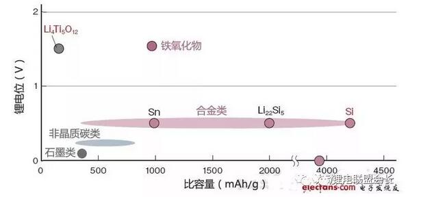 負(fù)極材料有硅(Si)和錫(Sn)等比容量為目前2倍以上即1000mAh/g的候補(bǔ)材料。長(zhǎng)壽命化方面的難度最高。