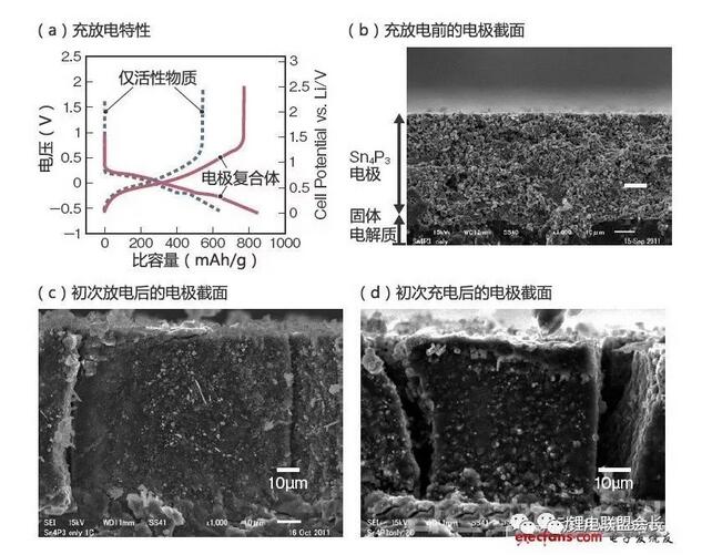 大阪府立大學(xué)發(fā)表的全固體電池采用具備導(dǎo)電性的Sn4P3。僅利用Sn4P3就可以作為全固體電池使用(a)。初次放電后和充電后仍與固體電解質(zhì)形成了良好的界面(b~d)。