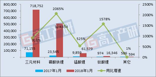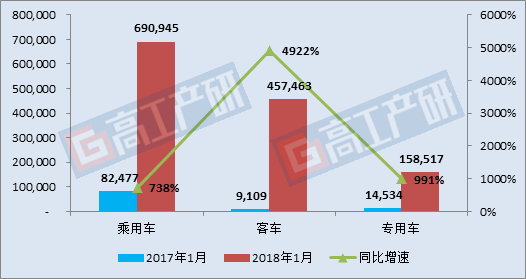 中國儲能網(wǎng)訊:高工產(chǎn)業(yè)研究院(GGII)最新數(shù)據(jù)統(tǒng)計顯示,2018年1月我國新能源汽車生產(chǎn)39,732輛,同比增長817%,動力電池裝機總電量約1.31GWh,同比增長1132%。
