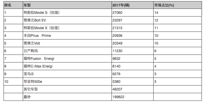 圖表 5 美國2017年新能源汽車銷量前十