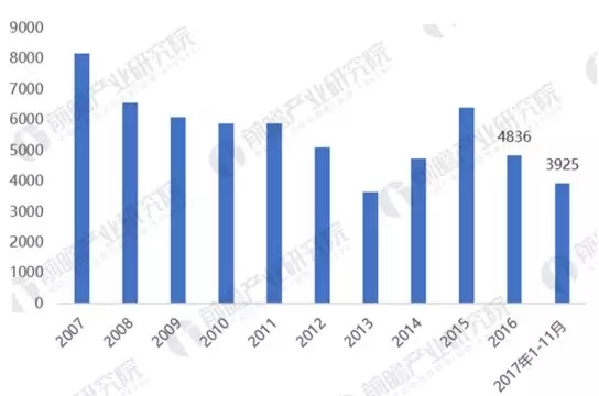 圖表1:2007-2017年全國發(fā)電新增設備容量情況(單位:萬千瓦)