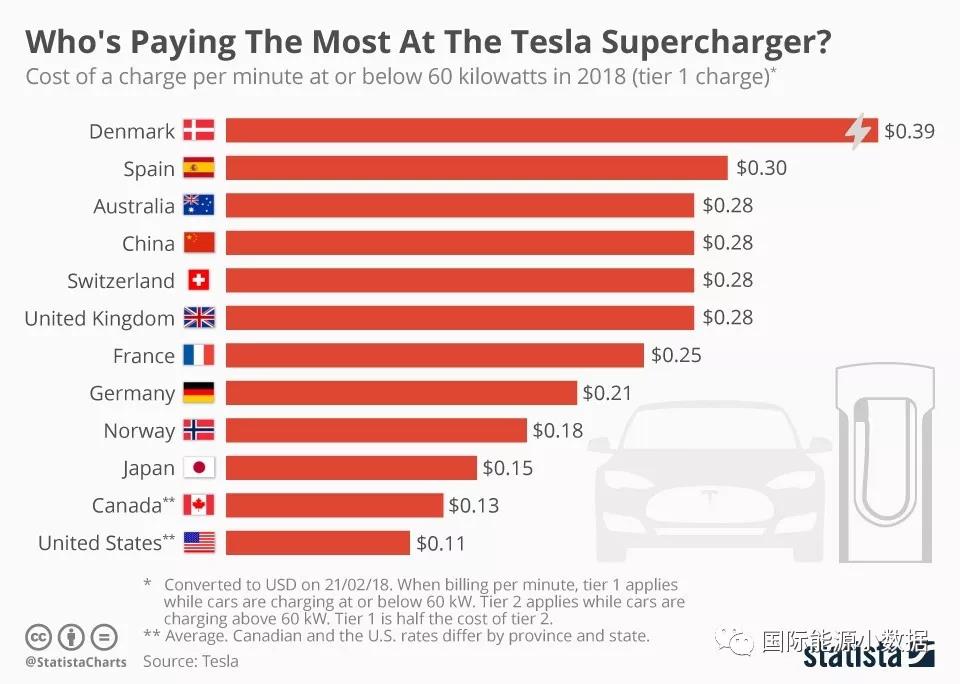 中國(guó)儲(chǔ)能網(wǎng)訊:根據(jù)特斯拉的數(shù)據(jù)(統(tǒng)計(jì)專業(yè)網(wǎng)站Statista轉(zhuǎn)載),特斯拉快速充電樁在各國(guó)的充電成本不同。以每分鐘充電的價(jià)格(60千瓦以下)計(jì)算,丹麥最貴(0.39美元),其次是西班牙(0.30美元),中國(guó)(0.28美元,合人民幣1.8元)與澳大利亞、瑞士、英國(guó)相當(dāng)。在特斯拉的主場(chǎng)美國(guó)充電價(jià)格最便宜(平均0.10美元),比中國(guó)充電成本低61%;加拿大(0.13美元)、日本(0.15美元)也屬于充電成本較低的國(guó)家。
