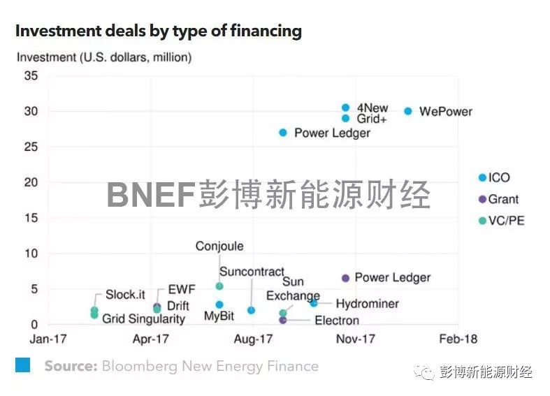 彭博新能源財(cái)經(jīng)數(shù)據(jù)顯示,2017年以來(lái),活躍于能源領(lǐng)域的區(qū)塊鏈創(chuàng)業(yè)公司已經(jīng)獲得了總額1.43億美元的投資,其中超過(guò)85%的資金均來(lái)自數(shù)十個(gè)ICO項(xiàng)目。