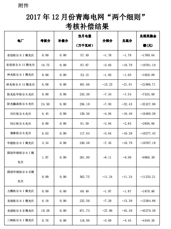 中國儲能網(wǎng)訊:根據(jù)《關(guān)于印發(fā)<西北區(qū)域發(fā)電廠并網(wǎng)運行管理實施細則>及<西北區(qū)域并網(wǎng)發(fā)電廠輔助服務(wù)管理實施細則>的通知》(西北監(jiān)能市場〔2015〕28號)規(guī)定,2017年12月份青海電網(wǎng)發(fā)電廠并網(wǎng)考核和輔助服務(wù)補償結(jié)果復核工作已完成,現(xiàn)予公布,請依據(jù)附件結(jié)算。