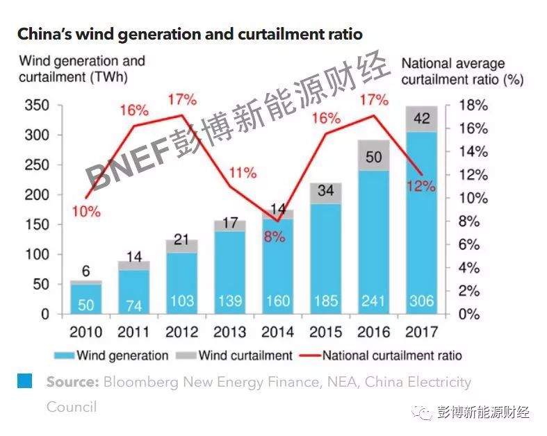 2017年,中國(guó)風(fēng)電限電情況顯著改善,限電總量下降至42TWh,較2016年峰值減少8TWh。中國(guó)風(fēng)電容量的平均限電率從2016年的17%下降至12%,全國(guó)平均發(fā)電系數(shù)則從2016年的20%提高至22%。