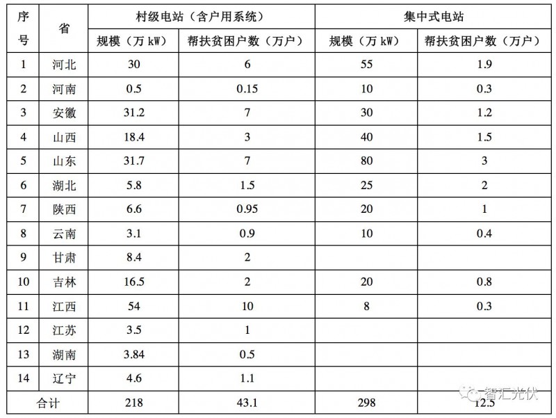 在此基礎(chǔ)上,2016年多個(gè)省份的能源局聯(lián)合當(dāng)?shù)氐姆鲐毠ぷ餍〗M,將“光伏扶貧”作為農(nóng)村脫貧的重要方式。2016年,在14個(gè)省份實(shí)施5168萬(wàn)kW光伏扶貧項(xiàng)目,幫扶貧困群眾55.6萬(wàn)戶(hù),如下表所示。