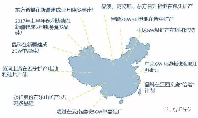 除了硅料環(huán)節(jié),各企業(yè)硅片環(huán)節(jié)的擴(kuò)產(chǎn)基本也都布局在西部地區(qū)。如單晶硅片龍頭企業(yè)隆基在云南楚雄布局了10GW的單晶硅片產(chǎn)能,將在2018年底投產(chǎn);晶澳、阿特斯、東方日升等企業(yè)在內(nèi)蒙也有擴(kuò)產(chǎn)。在此引用中國(guó)光伏行業(yè)協(xié)會(huì)王勃華秘書(shū)長(zhǎng)之前的圖片作為說(shuō)明。
