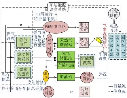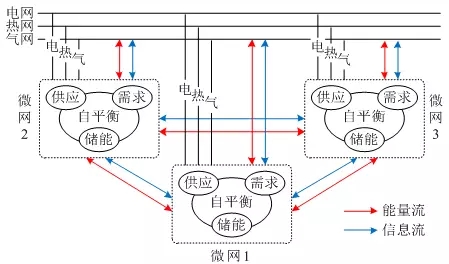 能源系統(tǒng)演化發(fā)展的基本單元是多能“供-需-儲(chǔ)”自平衡體,對(duì)應(yīng)園區(qū)微網(wǎng)[12],如圖2所示。微網(wǎng)通過(guò)股權(quán)并購(gòu)打破能源各自運(yùn)營(yíng)管控壁壘,利用互聯(lián)網(wǎng)和信息技術(shù)拉近能源生產(chǎn)和消費(fèi)距離,形成園區(qū)內(nèi)多能“供-需-儲(chǔ)”自平衡體。廣域范圍內(nèi)自平衡體在信息和經(jīng)濟(jì)激勵(lì)引導(dǎo)下,自主決策擴(kuò)展,與其他能源主體或自平衡體實(shí)現(xiàn)物理網(wǎng)絡(luò)互聯(lián),形成新互聯(lián)網(wǎng)絡(luò)、新自平衡體的過(guò)程,是能源系統(tǒng)演化發(fā)展的過(guò)程。能源系統(tǒng)演化發(fā)展是基于物理-信息-經(jīng)濟(jì)耦合的多個(gè)自平衡體交互,自適應(yīng)分散決。