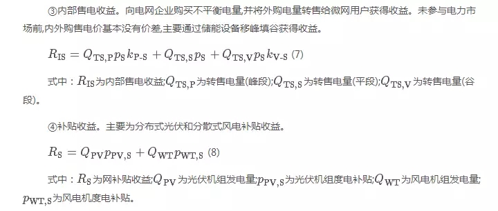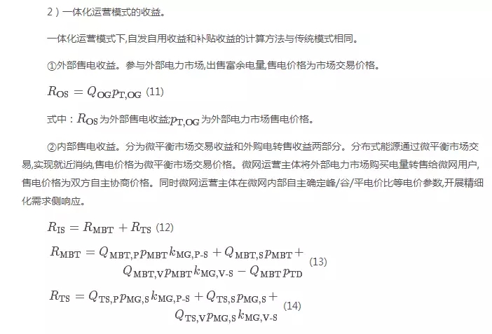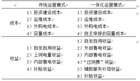一體化運(yùn)營(yíng)模式成本包括投資建設(shè)成本、運(yùn)維成本、外購(gòu)電成本以及自主申報(bào)的容量成本,收益包括自發(fā)自用收益、外部售電收益、內(nèi)部售電收益、“過(guò)網(wǎng)費(fèi)”收益、輔助服務(wù)補(bǔ)償收益和補(bǔ)貼收益。