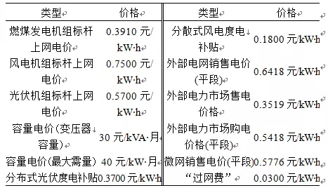 未參與電力市場(chǎng)前,微網(wǎng)內(nèi)部分布式能源上網(wǎng)電量以當(dāng)?shù)厝济喊l(fā)電機(jī)組標(biāo)桿上網(wǎng)電價(jià)結(jié)算,外購(gòu)電量以目錄銷售電價(jià)(考慮峰谷分時(shí))結(jié)算。